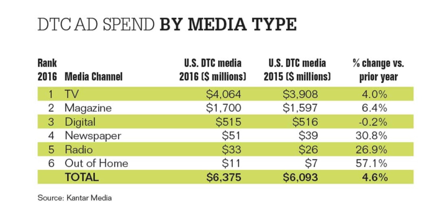 For all the talk about digital migration and channel agnosticism, pharma companies remain huge fans of direct-to-consumer television ads. In 2016, pharma spent $4.06 billion on TV buys, up 4% from $3.91 billion in 2015, according to Kantar Media.