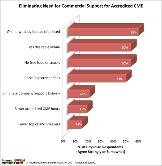 Physicians were asked what they would be willing to do to “eliminate the need for pharmaceutical/medical device company support” of CME activities they attended. The choices are shown in the list in the above chart.