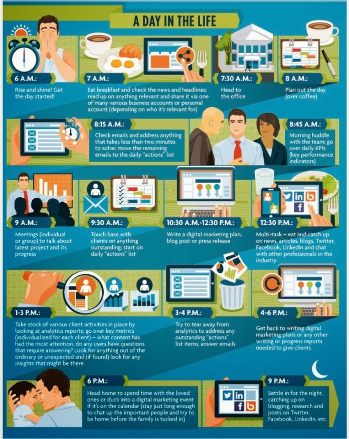 I was sent an email from a reader of Pharma Marketing Blog directing me to an infographic about the day in the life of a digital marketer. You can view the entire graphic here, but I want to focus on the section reproduced below and compare that to what my day looked like yesterday. You can compare it to your own day and see if you fit the pattern.