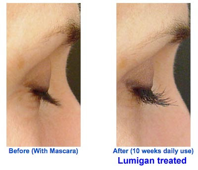 No trials are necessary either for certain dermatologists who are pretty upfront about using Lumigan off-label. Here’s the pitch one dermatologist makes on her Web site: “Achieve Luxurious Lashes with Lumigan®. Only available through physicians this miracle solution stimulates your own eyelashes to grow longer and thicker. Easy to use at home with only a once daily application.” The following photos are offered as evidence of Lumigan’s effectiveness in enhancing lashes: