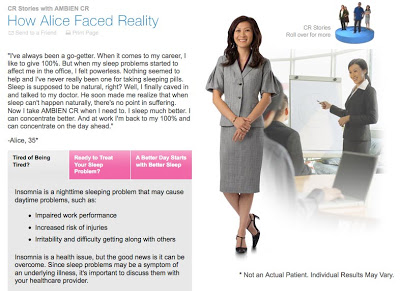 You’ve GOT to check out the new Ambien CR web site to witness what has to be a new low for “authentic” pharmaceutical marketing: patient testimonials from people who are “not actual patients” and not real people at all!