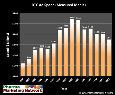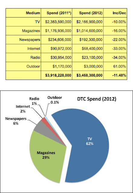 Previously, I estimated that the 2012 DTC spend would be in the range of $3.15 to $3.35 billion. This estimate was based on the 22% drop that cegedim reported. Nielsen, however, says the number is $3.47 billion, which is 11.5% less than the $3.98 billion spent in 2011.
