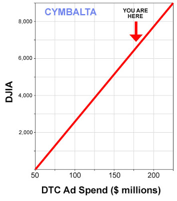 Not true! While advertising for the old drug Effexor “fell by more than half from a paltry $21.2 million in 2007 to $9.8 million last year,” Lilly spent $179 to advertise Cymbalta to consumers in 2008 — the same as in 2007. AdAge may call that “flat” but I call it WOW! You can’t possibly spend MORE than $179 million in a single year in DTC advertising for a single brand (Lunesta spent $183 million on DTC advertising in 2007 (see “Lunesta’s Ad Spending Spree and Other DTC Oddities“). $179 million vs. $182 million — I call that a dead heat!).