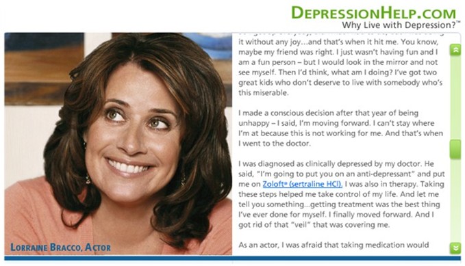 SB suggested, however, that the disease awareness ad may become the “new reminder ad” and serves merely to drive consumers to branded promotions in other media such as the Internet. He cited a Pfizer TV ad on depression, which did not mention any product name but urged viewers to visit the web site depressionhelp.com, which is clearly a site that promotes Zoloft, Pfizer’s antidepressant drug. On the site, Lorraine Bracco, the actor who played a psychiatrist on the HBO show The Sopranos, says “[my doctor] put me on Zoloft (link to zoloft.com). I was also on therapy… And let me tell you something…getting treatment was the best thing I’ve ever done for myself.”