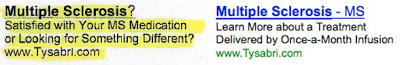 One FDA letter went to Biogen Idec Inc. over its multiple sclerosis drug Tysabri (find letter here). “Biogen’s ad includes a link to the Web site for the drug,” said the WSJ article, “which does contain the relevant risk information. The FDA said the link ‘does not mitigate the misleading omission of risk information from these promotional materials.'” See violative Tysabi Adwords below. On the left is the sample provided by FDA. On the right is the one I just found myself.