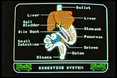 Operation: Frog ran on the Apple II computer, which at the time had the most advanced graphics of any personal computer on the market. It was an 8-bit computer with a screen resolution of 280×196. You could get 16 colors using a technique called “dithering.” Here’s a screen shot showing the frog’s digestive system: