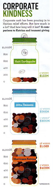 I just found the chart on the left in this week’s Newsweek magazine. It appears that pharma is not alone in terms of how little aid it is actually giving to Haiti compared to other recent disaster relief efforts. Not that money matters, of course.