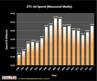 FACT #2: Spending on Direct-to-Consumer Advertising (DTCA) of prescription drugs is also increasing – more so, in fact. Kanter Media reported that the drug industry increased measured media ad spending by 19% in 2014 vs 2013 to $4.5 Bn (see chart below).