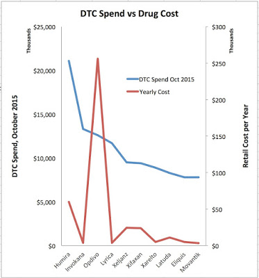 P.S. To see if there is a direct relation between the amount of money spent on advertising specific drugs and the cost of those drugs, I looked at the top 10 advertised drugs in October 2015 (here) and compared the ad spend to the yearly retail cost of the drugs. I came up with the following chart, which appears to show that some relatively low-cost drugs (e.g., Invokana and Lyrica) are among the most heavily advertised pharma brands: