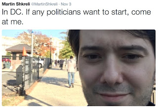 Shkreli taunted politicians on Tweeter days before the Senate invite, saying he was “In DC. If any politicians want to start, come at me” (read “Senate Invites Turing CEO Shkreli to Visit. Just What He Wanted!“) – a taunt typical of a Psychopath. Indeed, Shkreli has been called a “morally bankrupt sociopath,” a “greedy sociopath,” a “sociopathic bounty hunter,” and an “evil sociopathic asshole.”