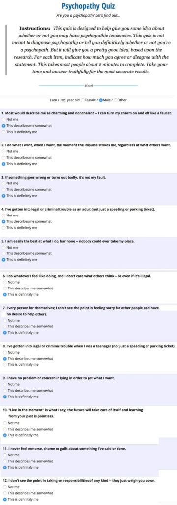 PsychCentral pulled no punches in its analysis of the results: “You scored a total of 21. You answered this quiz consistent with people who score high on measures of psychopathy and psychopathic behavior. This high score suggests that you likely have psychopathic tendencies.”