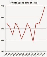 2014 was a banner year for TV DTC in that it saw the highest percentage spent on TV since at least 2001 (see chart and read “Pharma Ups Its Investment in TV DTC Advertising“).