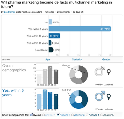 But given the “incredible difficulty” of implementing MCM, Starnes is hosting another survey on LinkedIn (here), which asks “Will pharma marketing become de facto multichannel marketing in future?” The results to date are shown in the chart below (click on chart for an enlarged view).