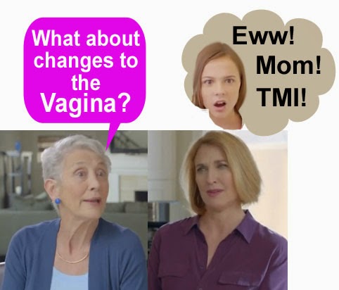 The mom first tries to talk to her teenage daughter about “becoming a woman.” “Mom! I know!,” says the daughter as she slams her bedroom door. Then, the mom acts the same way when her mom tries to talk to her about menopause. But her mom comes straight to the point: “What about changes to the vagina?,” she asks. Grandma then “changes the dialogue” and specifically talks about vaginal atrophy.