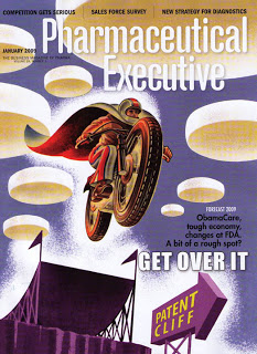As you can see, the cover depicts a dare devil motorcyclist reminiscent of Evel Knievel attempting a jump over the “patent cliff,” which represents the drop off in sales of Rx brand drugs when many of them will go off patent in the coming years.