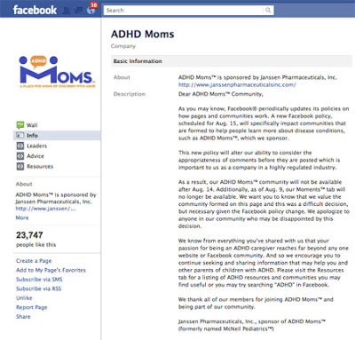 “A new Facebook policy, scheduled for Aug. 15, will specifically impact communities that are formed to help people learn more about disease conditions, such as ADHD Moms™, which we sponsor,” says a note on the ADHD Moms page.