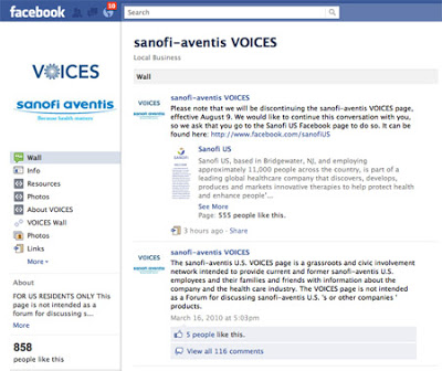 Sanofi-Aventis said it would discontinue its VOICES page, which became infamous when it was attacked by a “disgruntled” patient (see “Disgruntled Patient Shuts Down sanofi-aventis Facebook Page“).