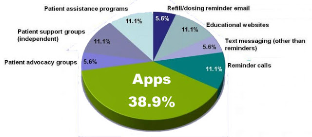 So, as I read this chart, nearly 40% of pharma marketers agree that patient adherence activities involving mobile “apps” will increase over the next five years. It appears that the “app” category here includes sending text reminder messages to mobile phones as well as downloadable applications such as the the Care4Today mobile app that was developed and recently released by Janssen Healthcare Innovation (see here).