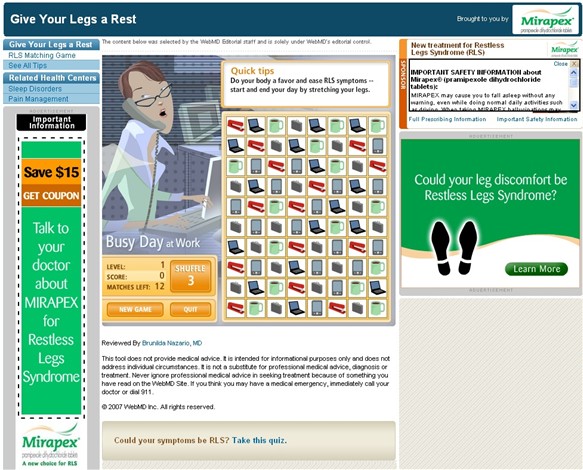 While the game is addictive and held my attention for a few minutes, I completely ignored all the surrounding Mirapex promotional advertising and almost did not notice the option to take the quiz to see if I had RLS. [Sample question: I often find myself tired and dragging during the day. Please answer “Yes” or “No”. It turns out that this is a trick question: “being tired and dragging” may be symptoms of old age or dissatisfaction with your routine office chores, but they apparently are NOT symptoms of RLS!]
