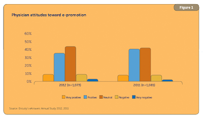 The percentage of physicians who believe that e-promotion — video details, online events, and virtual details — is inferior to face-to-face promotion increased from 33% in 2011 to 38% in 2012, according to Encuity’s 2012 eAnswers Annual Study (here). “Physicians age 45 or older are more likely than their younger peers to feel that e-promotion is inferior to face-to-face promotion (41% vs. 28%).” Meanwhile, only 14% of physicians find e-promotion to be superior to face-to-face promotion, down from 16% in 2011.
