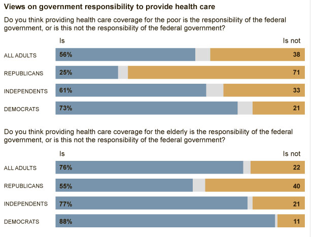 Results from the latest New York Times/CBS News poll conducted April 15-20 with 1,224 adults nationwide indicate that only 25% of Republicans think providing health care coverage to the poor is the responsibility of the federal government, whereas TWICE as many (55%) believe the federal government should provide health care coverage to the elderly. Meanwhile, 73% of Democrats, favor federal health care coverage for the poor. If only there was an American Association of Poor People (AAPP)!