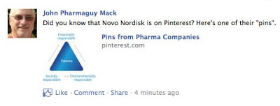 I “repinned” the image from the “About Novo Nordisk” board to a new board I created on my Pinterest site titled “Pins from Pharma Companies” (here). I was also able to “like” that image (pin) and post it to my Facebook wall as well: