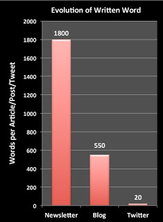 During the newsletter era, each article I wrote was about 1800 words. Three years later, when I started the blog, each post was about 550 words. Now, with Twitter, each tweet is about 20 words in length. So, over the years, I’ve written more “pieces” (blog posts and tweets) but have written fewer and fewer words per piece!