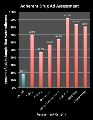 I took the liberty of plotting some of their results. Looking at the glass half-full, the following chart shows Percentage of Ads that are completely ADHERENT with FDA “guidelines” according to this study: