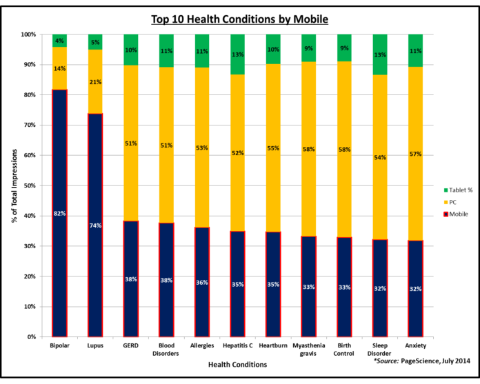 “Mobile advertising is becoming increasingly important to pharma advertisers, and many agencies question which health conditions are most relevant for mobile. This analysis, to be updated monthly, will provide a guide to which health conditions exhibit the most relative mobile interest,” said Bill Jennings, CEO of PageScience.