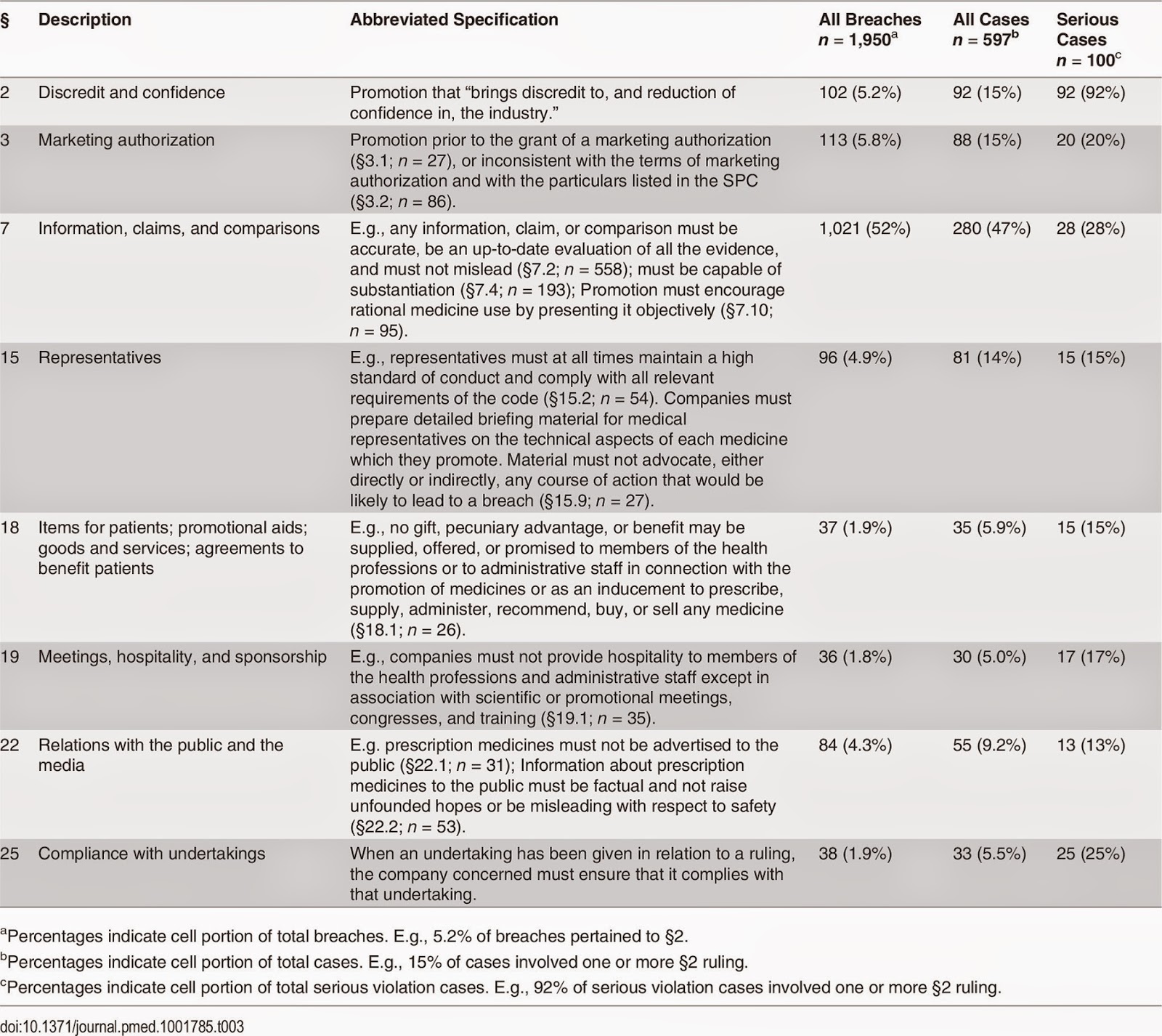 In the UK the most cited violations (52%) are of section 7 of the drug industry’s “Code of Practice,” which concerns “information, claims, and comparisons.” Section 7 says “any information, claim, or comparison must be accurate, be an up-to-date evaluation of all the evidence, and must not mislead.” Here’s the table showing all the code violations in the UK (a similar table is presented for Sweden):