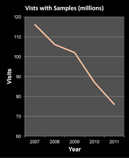 Sales rep visits that included samples have dropped even faster. According to Cegedim Strategic Data (SD), the number of detailer visits that included samples has decreased 35% from 116 million in 2007 to 76 million in 2011 (see ” Spending on Drug Samples Continues to Decline“).