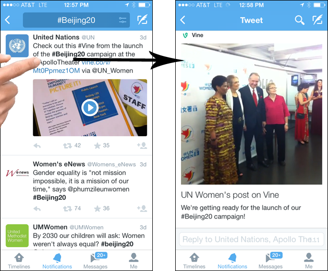 This is how a Twitter Card post looks on an iPhone using the latest version of the Twitter app (version 6.8). On the left is the timeline you would normally see without doing anything special. On the right is what you see when you click on the tweet.