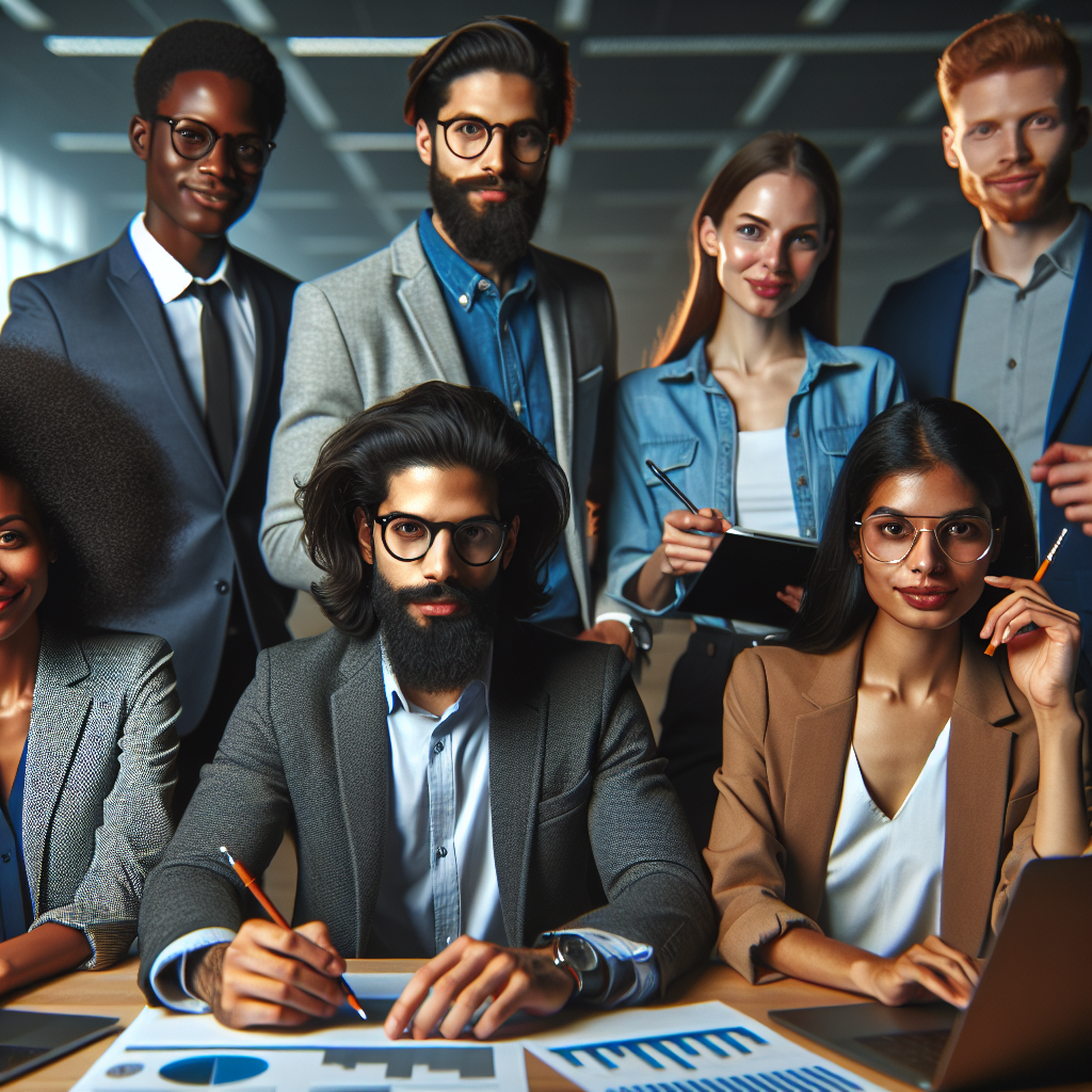 A team of pharmaceutical marketers reviewing social media ad campaign metrics in a modern office.