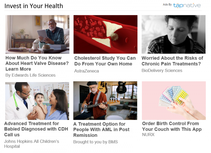 Native ads are clearly disclosed as such, but, because they are formatted to match the surrounding content, are located within the content, and are contextually relevant, those offers are engaged with at up to 20X that of branded ads. Healthcare content is particularly useful for reaching in-market, high intent target audiences at the right time – while they are seeking answers to important questions. The screenshot below is a native ad block from Tap Native, a leading healthcare-focused native ad platform. Note there are multiple offers, unlike a single banner ad, so users can and do make multiple considerations.